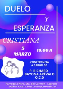 El pasado jueves 5 de marzo, a las 18:00 horas, tuvo lugar en el salón de actos de la parroquia la conferencia titulada “Duelo y Esperanza Cristiana”, impartida por el P. Richard Bayona Arévalo. Durante la charla, el sacerdote ofreció una profunda reflexión sobre cómo afrontar el dolor y la pérdida desde la fe cristiana, recordando que el duelo, vivido a la luz del Evangelio, puede convertirse también en un camino de esperanza y confianza en Dios. Los asistentes valoraron muy positivamente este encuentro formativo que ayudó a iluminar, desde la fe, una realidad tan humana como es el sufrimiento.
