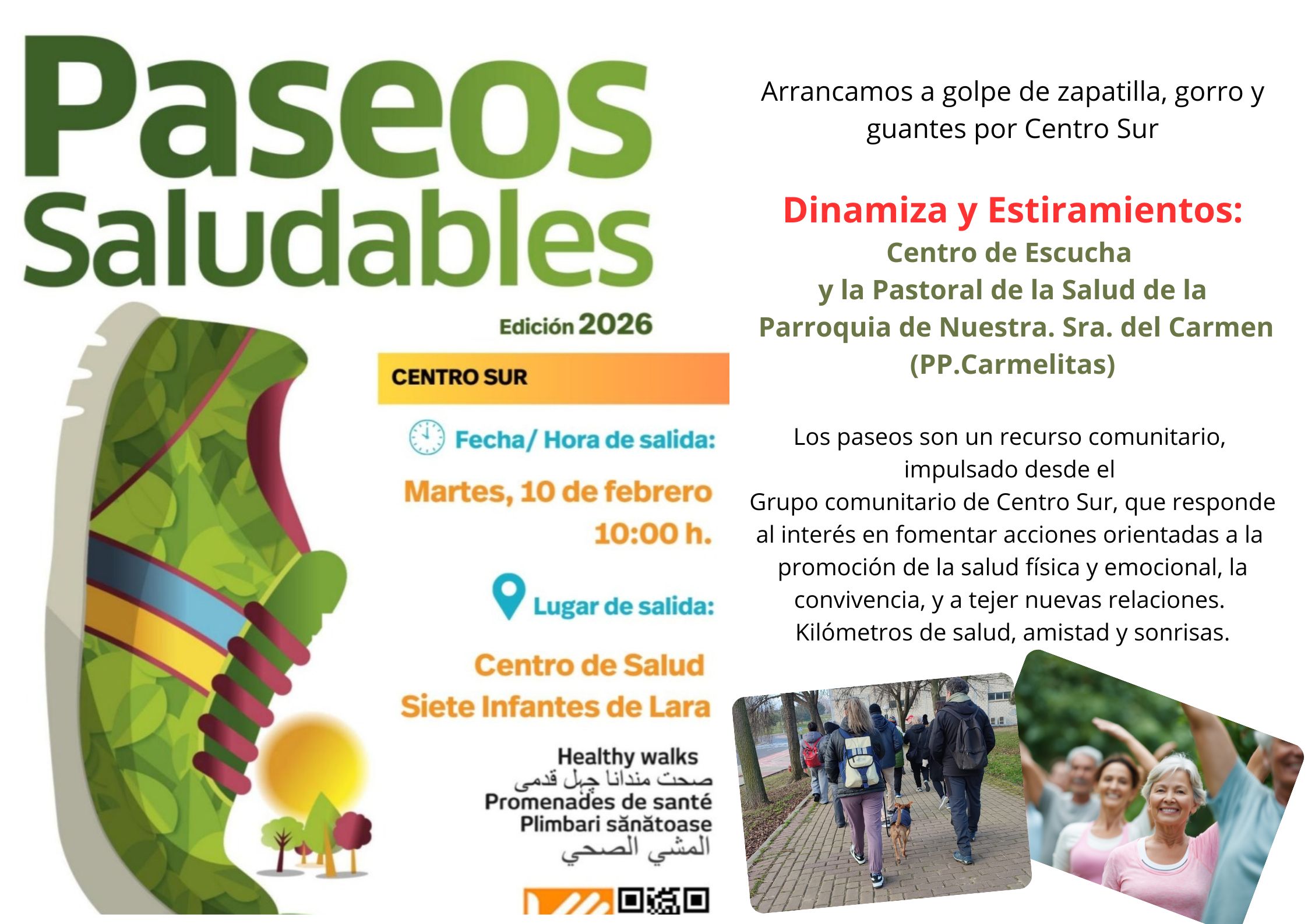 El martes día 10, os invitamos a participar activamente en la actividad de paseos saludables, dinamizará la actividad los voluntarios del Centro de Escucha y la pastoral de la salud de la parroquia. La “quedada” será en la puerta principal de la parroquia a la 9:20 de la mañana, y la salida será desde el centro de salud de Siete Infantes de Lara a las 10:00.h. de la mañana. Si las condiciones climatológicas no son favorables por las lluvias se suspenderá la actividad.