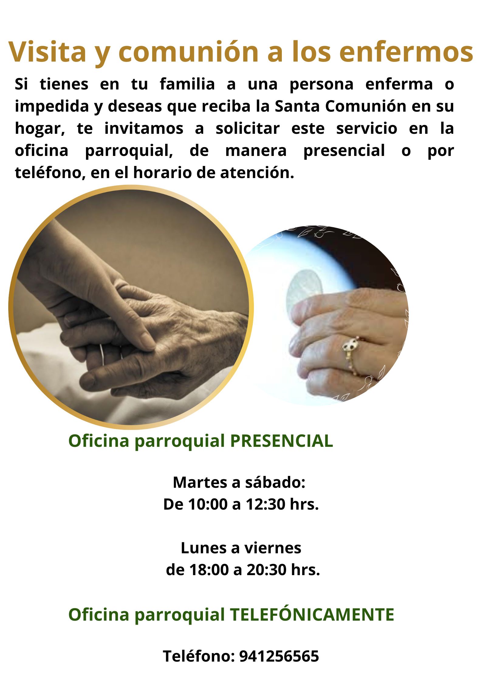 La Pastoral Parroquial del Enfermo les invita a participar en las actividades programadas para la Jornada Mundial del Enfermo durante febrero. Encontrarán información completa sobre todos los eventos organizados por la Pastoral del Enfermo en los folletos disponibles en la página web y en las mesas de la iglesia.